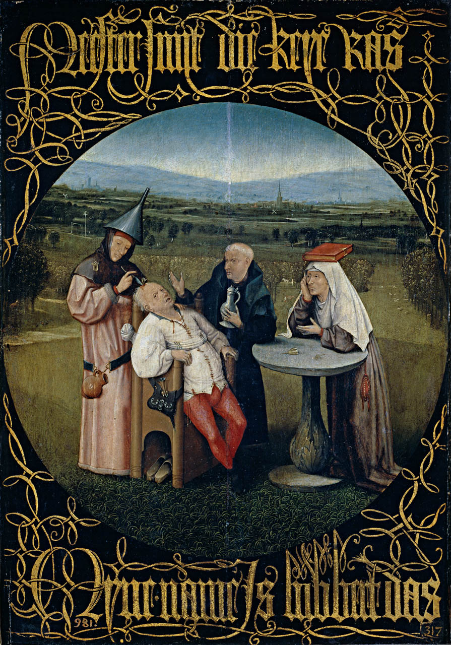 El Bosco había vivido entre la oscuridad de la Edad Media y las nuevas ideas que llegaban del Renacimiento. En ese momento de nueva era, empezaban a buscarse causas orgánicas para todas las enfermedades. Es por esto que se difundió la creencia de que la locura era resultado de determinadas excrecencias cerebrales que, al crecer, ejercían una presión en el cerebro causante de la perturbación mental. Muchos curanderos (cirujanos, barberos…) aprovecharon para cobrar por realizar una curiosa operación craneal en la que, presuntamente, extraían la protuberancia. Pero en la cruda realidad, únicamente se realizaba un corte incisivo en la superficie de la piel mientras que, con un hábil juego de manos, el farsante se hacía con una pequeña piedra en su mano. Después, la exhibía ante los asombrados espectadores de la operación que creían haber visto que salía del cráneo del enfermo.
